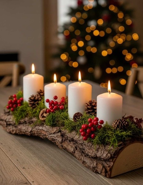 Un centrotavola natalizio dallo stile naturale e caldo, realizzato su una base rustica e arricchito da elementi tipici delle feste come candele, bacche decorative, pigne e muschio. Una composizione semplice ma d’impatto, ideale per creare un’atmosfera accogliente e autentica sulla tavola delle feste.