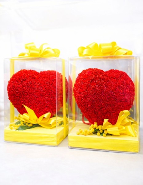 Romantica ed elegante composizione decorativa a forma di cuore realizzata con numerose roselline rosse in gomma piuma, racchiusa in una raffinata box trasparente con base e fiocco decorativo giallo. Alla base della composizione sono presenti delicati dettagli floreali di mimosa che donano un contrasto luminoso e raffinato.